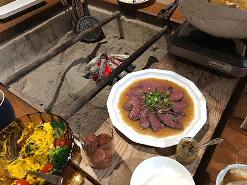 日本の最小行政区画「小字」。ここ字大芦でまちづくりならぬ「字づくり」に果敢に挑む素敵なご家族と囲炉裏を囲む。地元の棚田で仲間たちと作ったお米と自宅の畑で作った野菜、そして裏山で狩猟し、自ら捌いたジビエ(今回は猪の角煮と鹿のローストビーフ)が食卓を彩る。